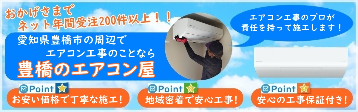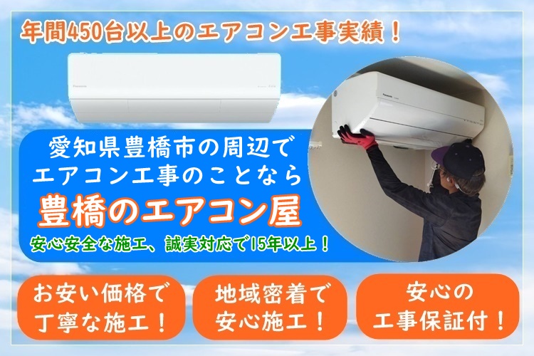 豊橋のエアコン屋は家庭用のエアコン工事を主にエアコン取り付け・取り外し工事をおこなっている地域密着のエアコン業者で、豊橋市を中心に愛知県で活動しております。